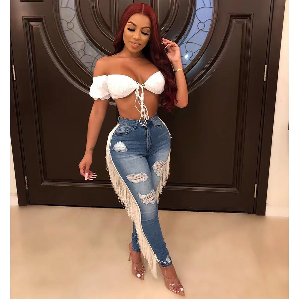 Ladies' Ripped Tassel Jeans, Fashionable And Personalized Street Style Denim Pants, Pencil Pants, And Leggings